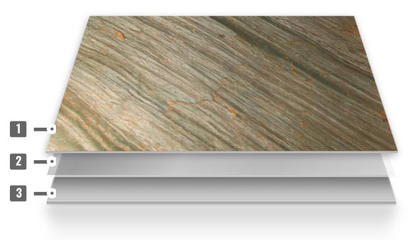 Przekrój forniru kamiennego składa się z cienkiej warstwy naturalnego kamienia, która jest podparta elastycznym podkładem składającym się z włókna szklanego oraz żywicy poliestrowej.