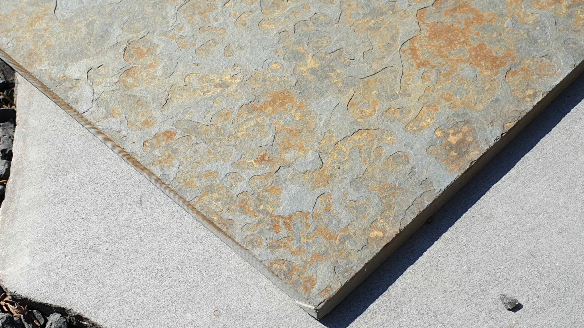 Przekrój płytki z łupka ukazuje jej warstwową, łupkowatą strukturę, która nadaje powierzchni surowy, naturalny charakter i niepowtarzalny wygląd.